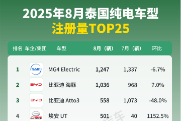 8月泰国纯电动车销量(指注册量)9,825辆(占泰国乘用车总量39,325辆的25.0%),较去年同期增长54.4%,较今年7月的10,194辆下降3.6%。 8月泰国纯电动车销量前十均为中国品牌车型;第11-20车型中,除中国品牌外,还有特斯拉Model Y、Model 3。