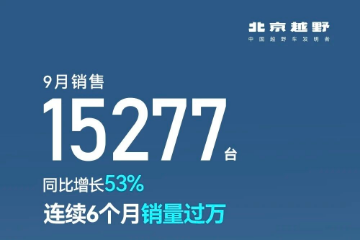 北京越野9月销售15,277台,同比增长53%,环比增长15.6%,连续6个月销量过万。