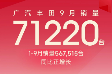 广汽丰田9月零售销量71,220台,环比增长7.8%;1-9月销量567,515台,同比正增长。