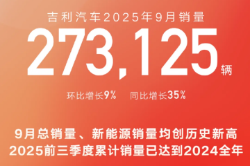 吉利汽车集团(含吉利、极氪、领克品牌)9月销量273,125辆,同比增长35%,环比增长9%,其中,出口40,665辆;新能源汽车165,201辆,同比增长81%,环比增长12%,创历史新高。 1-9月累计,吉利汽车总销量2,170,189辆,同比增长46%。
